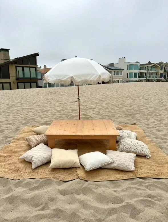Includes - 1 Low Picnic Table, White Table Runner, 2 Rattan Rugs, Pillows for Seating
